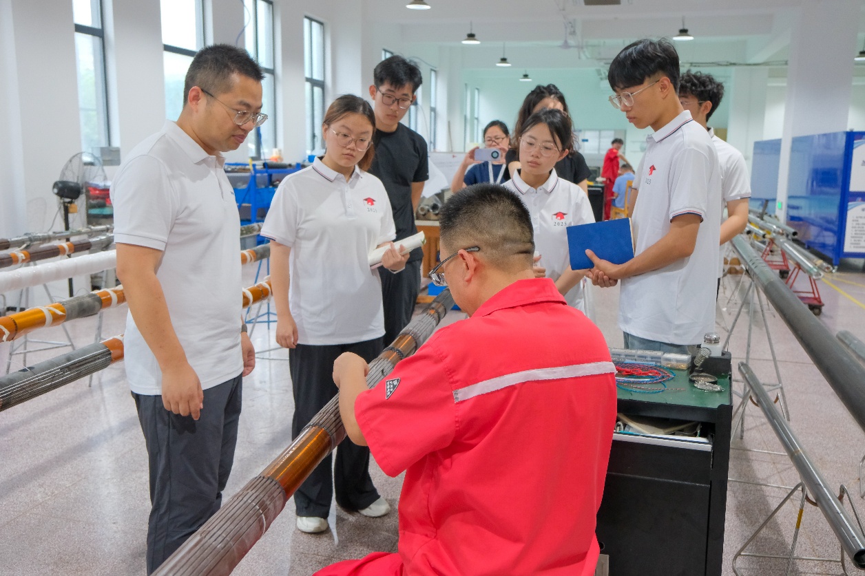 在杭州丰禾石油科技有限公司,工程师为实践团讲解自主研发的裸眼井、套管井、高温过钻杆等五大类测井仪器,已实现规模化应用,覆盖全国主要油田并出口海外,还参与了塔科一井、川科一井两大万米深井测井任务,让实践团成员直观触摸到智能装备“芯”制造的硬核实力。