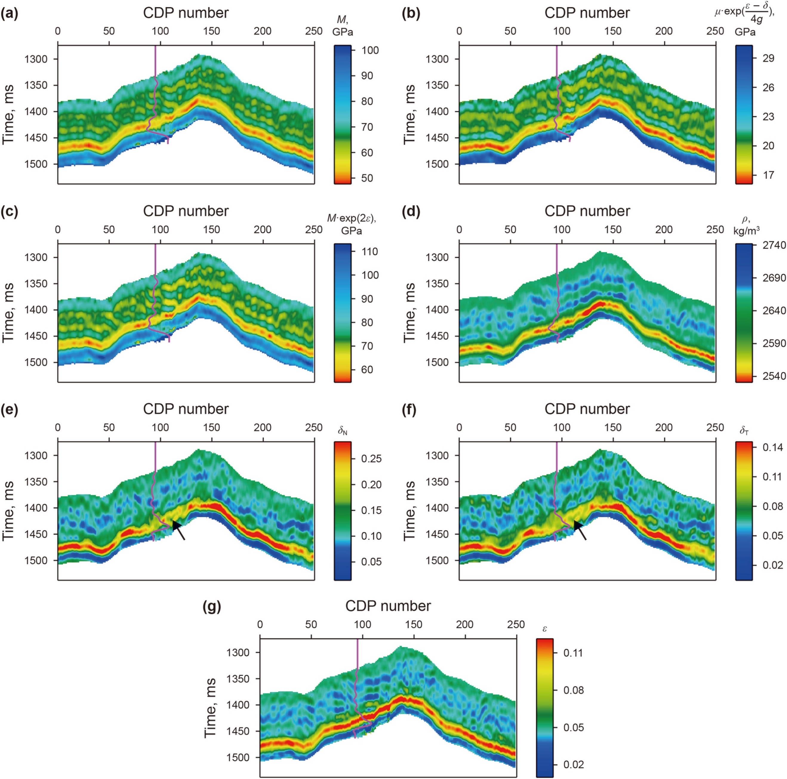 图1.正交各向异性介质模型参数反演结果。(a)纵波模量,(b)各向异性剪切模量,(c)各向异性纵波模量,(d)密度,(e)法向裂缝弱度,(f)切向裂缝弱度,(g)Thomsen各向异性参数epsilon;粉色曲线表示井位置处对应曲线的高切滤波显示